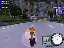 In Moto Racer 2, the player controls a motorcyclist on various terrain; the game offers motocross races and superbike street races.[3] The game contains 32 race tracks and 16 motorcycles split evenly between motocross and superbike, and allows for the player to edit any track in the game using the level editor.[4] It contains many of the same features as the previous game, including a split screen mode for the PlayStation version, and the player is allowed to choose between terrain set-ups prior to games.[5] The game allows players to change between simulation mode and arcade mode to choose between a more realistic or playful experience.[5]