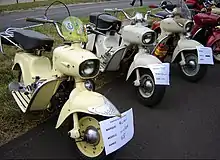 The entire body (with exception of the front forks, crash rails and legshields) was produced in cast aluminium, with the front and rear castings bolted to the engine to form a monocoque which resulted in a light and rigid construction. The rear swinging arm, chaincase and silencer box were also constructed in cast aluminium. These models originally had 8 inch wheels, but by 1958 they reverted to 10 inch which gave a better stability and ground clearance.[3]