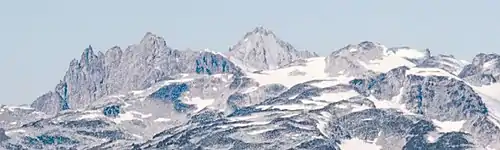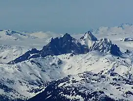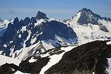 Three main summits comprise the Mount Cayley massif.[5] The highest and northernmost is Mount Cayley with an elevation of 2,385 m (7,825 ft).[6] Its northeastern flank abuts the southern end of the Powder Mountain Icefield.[5][6] This is a 9 km (5.6 mi) long and 5 km (3.1 mi) wide irregularly-shaped glacier that trends slightly to the northwest.[6] Just southwest of Mount Cayley lies Pyroclastic Peak, 2,341 m (7,680 ft) in elevation. It contains a jagged summit ridge of many slender rock pinnacles, the largest of which is known as the Vulcan's Thumb.[3] Wizard Peak with an elevation of 2,240 m (7,350 ft) is east of Pyroclastic Peak and is the lowest of the three main summits.[6]