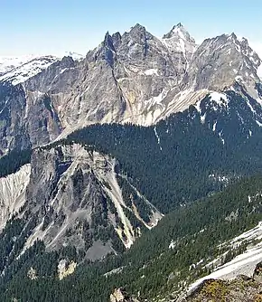 Mount Cayley as seen from the southeast. Summits left to right are Pyroclastic Peak, Mount Cayley and Wizard Peak.