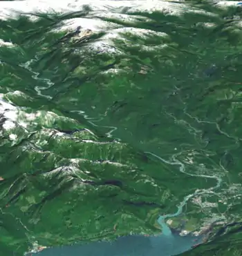 NASA World Wind imagery showing the Cheakamus valley on the right and the Squamish valley on the left upstream. The Mount Cayley is on the upper left slope of the mountain ridge between the two valleys. Squamish is in the bottom right corner of image.