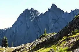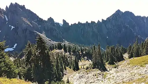 Mount Cruiser is a 6,104-foot-elevation (1,860-meter) mountain summit located in the Olympic Mountains, in Mason County of Washington state.[3] It is situated in Mount Skokomish Wilderness on land managed by Olympic National Forest. Cruiser is the highest point on Sawtooth Ridge, and its nearest higher peak is Mount Skokomish, 2.1 mi (3.4 km) to the north-northeast.[1] Cruiser has two sub-peaks, Alpha (6,040 ft; 1,840 m), and Beta (5,920 ft; 1,800 m), the latter of which lies on the Olympic National Park boundary.[1] The first ascent of the peak was made in 1937 by Paul Crews and Ray Layton. The mountain was named by the first ascent party to recognize their club, the Bremerton Ski Cruisers.[4] The mountain's name was officially adopted in 1961 by the United States Board on Geographic Names.[3] Precipitation runoff from the mountain drains into the Hamma Hamma River.
