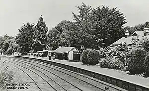 The (now closed) railway station, opened in 1901, was originally named 'Olinda Vale'. This was changed to 'Evelyn' after the county in which it is centrally placed, possibly as part of an attempt by the Victorian Railways to shorten names of stations. In 1919, the local progress association persuaded the Railways to add the "Mount" to encourage visitors to the healthy mountain area, which is the highest point on the railway (now the Lilydale to Warburton Rail Trail).[4]