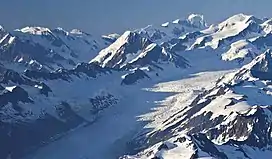 Mount Glenn is a 9,806-foot (2,989 m) elevation glaciated summit located 40 mi (64 km) northwest of Valdez in the Chugach Mountains of the U.S. state of Alaska. This remote mountain north of Prince William Sound, set on land managed by Chugach National Forest, is situated 6.44 mi (10 km) west-southwest of Mount Witherspoon, and 9.34 mi (15 km) west of Mount Einstein. It is part of the Dora Keen Range, which is a 25-miles-long divide separating Harvard Glacier from Yale Glacier.[4] The mountain's name was applied in 1911 by Lawrence Martin, and officially adopted in 1930 by the U.S. Board on Geographic Names to honor Edwin Forbes Glenn (1857–1926), an Army officer who explored this College Fjord area in 1898.[4][5] The Glenn Highway is also named for this same person.[6]