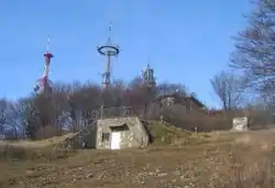 The development of broadcasting technology made Mount Krim of increasing interest due to its dominant location. In 1971, the Slovenian broadcaster RTV started building a transmitter on the mountain in order to provide television coverage to an area that could not be reached by the transmitters at Mount Krvavec and Ljubljana Castle. The Yugoslav military also took an interest in the location and started building its own facilities at the same time as RTV. The summit of Mount Krim was then closed to hikers and other members of the public, who could go no higher than Mount Krimšček (941 m), also known as Little Mount Krim (Slovene: Mali Krim).[6] While it was used by the military, the mountain was an important radio point for the army, serving as a radio and radio-relay point that covered most of Slovenia and also maintained contact with similar points throughout Slovenia and the rest of Yugoslavia. The exterior of the military structure indicates that it was similar to that found at Guslica on Mount Risnjak. In 1991, during Slovenia's Ten-Day War of independence, Slovenian Territorial Defense units sought to force the staff at the facility to surrender, but without success. The structure continued to be used by the Yugoslav military until October 1991, when the Yugoslav People's Army withdrew from Slovenia. After 1991 the summit was again accessible to the public and the military structure is more or less abandoned. Next to it there is a small mountain lodge, which is visited by thousands of hikers every year.
