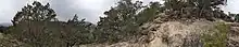 Panoramic outlook near the peak of Mount Old Baldy. The contrast of barren, rocky ground against the foliage alongside its peak represents the "bald head" which serves as the mountain's namesake.
