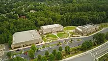 Aerial view of the East Campus including the Drummond Center (left), H Building (center) and Geier Hall (right). The South Campus is directly across the street.