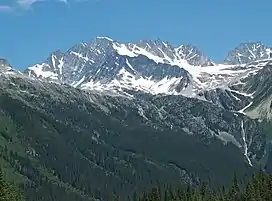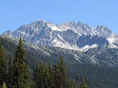 Mount Rogers, is a 3,169-metre (10,397-foot) massif located in Glacier National Park in the Selkirk Mountains of British Columbia, Canada. Mount Rogers is situated at the north end of the Hermit Range, and is the highest point of the range.[3] Its nearest higher peak is Mount Sir Donald, 12.57 km (7.81 mi) to the southeast.[3] The peak is prominently visible from eastbound Highway 1, the Trans-Canada Highway at Rogers Pass. The Rogers massif includes five individually-named summits: Rogers Peak, Grant Peak, Fleming Peak, Swiss Peak, and Truda Peaks.[4] Numerous glaciers radiate from all sides, including the Rogers Glacier, Swiss Glacier, Tupper Glacier, and Hermit Glacier.