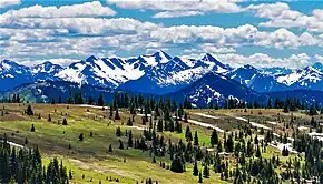 The history of the formation of the Cascade Mountains dates back millions of years ago to the late Eocene Epoch.[6] With the North American Plate overriding the Pacific Plate, episodes of volcanic igneous activity persisted.[6] In addition, small fragments of the oceanic and continental lithosphere called terranes created the North Cascades about 50 million years ago.[6]