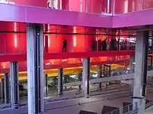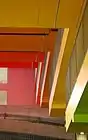 The parking garage contains parking spots for 480 cars. The space has up to 16 m high ceilings, and the underside of each level of apartments is covered in aluminum painted in a distinctive colour scheme of psychedelic hues which, as a tribute to Danish 1960s and '70s furniture designer Verner Panton, are all exact matches of the colours he used in his designs. The colours move, symbolically, from green for the earth over yellow, orange, dark orange, hot pink, purple to bright blue for the sky.[2] Besides being a sloping podium for the residential units to sit on, maximizing sunlight and views, the central garage space also serves as an atrium containing the building's circulation, affording the only access to the apartments. A set of metal stairs climb through the main space over the parking lot, providing access to the hallways across suspended industrial-looking metal-clad concrete connections, while a Swiss-manufactured, ski lift-style inclined elevator moves along the wall of the garage. Each level's hallway is enclosed and encased in painted metal both on the interior and exterior, colored according to floor in the same hues used in the main space.