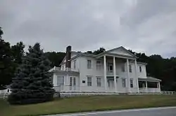 Mountain View Stock Farm is located east of the central village of Benson, on a property roughly bisected by Vermont Route 22A, the main north-south route through the community. It consists of 55 acres (22 ha), mainly rolling fields, with broad views across the fields to the east. The buildings of the farm are clustered in three areas along the road, with the main house in the northernmost group. It is a T-shaped two-story wood frame structure, set on the west side of the road, with a gabled roof and clapboard siding. A two-story gabled portico projects in front, supported by slender round columns, a porte-cochere extends to the right, and en enclosed porch, topped by a balustrade, extends to the left. Nearby stand a 20th-century barn and indoor riding arena. A second house, along with barn, creamery, and cattle shelter, are clustered about 500 feet (150 m) to the south, and a third cluster including another house is another 800 feet (240 m) down the road.[2]