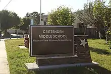 Crittenden Middle School is located at 1701 Rock St., Mountain View, CA 94043.[7] The school mascot is the panther.[8] Before the district's merger, the school was part of the Whisman School District.[9]