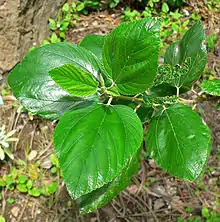 Ceanothus leaves may be arranged opposite to each other on the stem, or alternate. Alternate leaves may have either one or three main veins rising from the base of the leaf.[16]