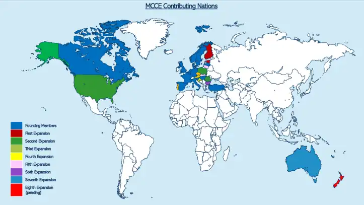 The MCCE was officially established on 1 July 2007 as the merger of the earlier European Airlift Centre and the Sealift Coordination Centre.[4] On this date, the initial 15 signatory countries became official members. The MCCE has since been through several cycles of expansion.[5]