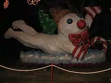 Mr. Bingle was also displayed as a large papier-mâché figure on the front of the flagship Maison Blanche store on Canal Street, first standing next to Santa Claus and later in a flying form. The flying figure was displayed at the Metairie, Louisiana Maison Blanche Store and later at a Dillard's Metairie location when the Canal Street store was closed.[4] By 2004 the Mr. Bingle figure was in such poor condition that it could not be displayed, although Dillard's continued to market small replicas.[8] This figure has since become the most iconic of all Mr. Bingles, with most of the non-plush toy merchandise featuring the character in the exact same pose as the papier-mâché figure. By 2011 the Mr. Bingle figure was again reported to be in need of repairs.[9]