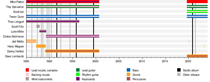 All of the members of the 'classic' lineup of Mr. Bungle are multi-instrumentalists. The timeline below reflects only their main roles. Members of the band were known to switch instruments mid-performance.