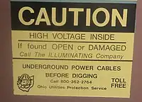 NEMA standard 260 was the first warning label system developed and standardized by an industry.[5] It went beyond just the Mr. Ouch symbol, incorporating the new symbol as part of complete label design that would include a new header design with the 'international alert symbol', an exclamation mark inside a triangle, on a single solid color background. The accompanying text message went beyond just stating the hazard posed, high voltage electricity; and included a clear statement of the consequences, how to avoid them, and what to do if the equipment wasn't secured. These additions helped impress the gravity of the danger, and alerted the public that an unsecured box was dangerous, should be reported promptly, and who to report it to.[4] The standard included two designs, one intended for use on the outside of equipment, and a more urgent label for placing inside equipment, where danger of electric shock was always present.[1][4]