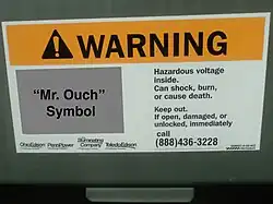 Mr. Ouch is a hazard symbol developed by the US’s National Electrical Manufacturers Association (NEMA) to represent electrical hazard within pad-mounted transformers. Unlike other high-voltage warning symbols, Mr. Ouch was specifically designed with young children in mind.[1] It is part of NEMA Standard 260-1996, Safety Labels for Pad-Mounted Switchgear and Transformers Sited in Public Areas, which lays out design guidelines for a complete label design that incorporates the Mr. Ouch symbol.[1]