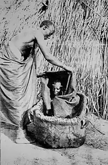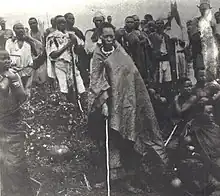 Regardless of the specifics of her affiliation with the Rwandan court, soon after arriving in Mpororo, Muserakande became known as a popular umugirwa, or medium of Nyabinghi.[2] Oral traditions from the region recognise many possible origins for Nyabingi. The most prominent legends at present attributes Nyabinghi's origins to Kitami, an 18th century Queen of Mpororo kingdom (in modern-day southern Uganda / northern Rwanda), whose murder by her husband, Murari, was followed by a series of natural disasters and other catastrophic events.[7] After her death, any atrocities that happened were considered to be due to Nyabinghi's revenge, while any good things that happened were attributed to her positive interference which she exercised through mediums who had been possessed by her spirit.[8] These possessions led to the emergence of a new religious practice that European colonisers at the time widely referenced as a cult. Adherents provided gifts to Nyabinghi mediums, known collectively as abagirwa, who then spoke with (and for) Nyabinghi to convince the spirit to intervene positively in people's lives.
