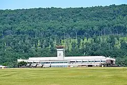Muir Army Airfield was established as an airstrip in the 1930s and was originally the central parade ground and emergency landing field of the Fort Indiantown Gap military reservation. On July 12, 1941, the first airplane piloted by Major Edgar Scattergood, Air Office of the 28th Infantry Division, landed on the newly dedicated Muir Field.[2] The 3200 x 100 foot runway was of good size for fixed-wing aircraft at the time; however, the Army Corps of Engineers built the runway in a northeast-southwest direction. The prevailing wind blows out of the mountains from the northwest, so there is usually a permanent crosswind during normal weather conditions.