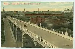 This bridge is the second to be constructed at the current site to connect the Allison Hill neighborhood of East Harrisburg to Downtown. It replaced an iron and fire-prone, wood-decked structure erected in 1891, which was heralded as a unifier of a "Greater Harrisburg."[1] The concrete replacement bridge that was built in 1909 was a marvel at the time, and is eligible to be listed on the National Register of Historic Places.[2]