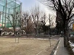 The park, viewed from the north. Sports courts are visible. In the background, the rear of the fenced-off bust of Park Chung Hee is visible. (2023)
