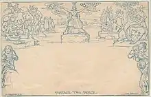 The design incorporated a munificent Britannia at the centre top with a shield and a reclining lion surrounded on either side by a representation of the continents of Asia and North America with people reading their mail in the two lower corners, bestowing the benefits of mail services to the countries of the world under British control.[1] The Mulready illustration, engraved by John Thompson, was printed such that it appeared on the face of the sheets when folded. The Mulready letter sheets followed the traditional letter sheet design and could be folded as normal while the envelopes were a diamond-shaped sheet which, when the sides were folded to the center, became an envelope and the overlapping edges were then sealed.