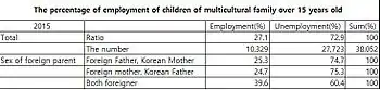 Present situation: The percentage of employment of children of multicultural family over 15 years old is 27.1% in 2015. It means only 10,329 children find a job among total 38,052 children. The percentage of employment of children who both parents are foreigner is 39.6%. And it is higher than children who are grown by Korean mother and foreign father (25.3%), children who are grown by foreign mother and Korean father (24.7%).[12]