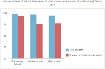 About the percentage of school attendance of student of multicultural family, elementary school attendance percentage is 97.2%, middle school is 75.6%, high school is 76.7%. It shows a low standard in compared with total percentage of school attendance. About the total percentage of school attendance, elementary school is 97.2%, middle school is 96.2%, and high school is 93.6%.[10]