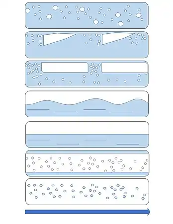| Slug flow | Defined by the intermittent sequence of liquid 'slugs' containing disperse gas bubbles alternating with longer bubbles with greater width. Unsteady flow regime even when velocities are kept constant.[26] |