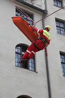 Since May 1996 the Munich professional fire department maintains a height rescue group at the fire station in Föhring, from which five personnel are constantly on duty. They are part of the normal fire service and attend to conventional firefighting operations. About 110 times a year, however, they must also be alerted, since conventional life-saving equipment such as turntables, fall protection or the like is no longer sufficient. They also working closely with several air rescue services, which also help with rescue helicopters if necessary.