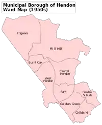 Hendon was an ancient civil parish of around 8,250 acres (33 km2) which included Mill Hill on the border of Hertfordshire, as well as Golders Green and Childs Hill on the border of what became the County of London. In 1894 it was created an urban district of Middlesex and in 1932 it became a municipal borough. The municipal borough was abolished in 1965 and the area became part of the London Borough of Barnet.