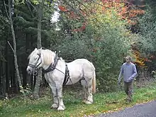 Various names have been coined for the municipal horse: cheval cantonnier, cheval citadin, cheval communal and cheval citoyen. A symposium held in Avignon in 2000 was devoted to the "horse in the city". The term "municipal horse" was made official when the first Congrès national des chevaux territoriaux was held in Trouville-sur-Mer in 2003.[1] At the end of 2012, a mission by the Conseil général de l'alimentation, de l'agriculture et des espaces ruraux (CGAAER) defined the term as "a horse used by a local authority (either on its own account or as a service provider) to carry out public service missions on its territory, such as passenger transport, waste collection, maintenance of green spaces or natural areas, prevention and security...".[2] In Switzerland, the term "urban horse" is used.[2] However, the notion of "municipal horse" remains difficult to define.[3]