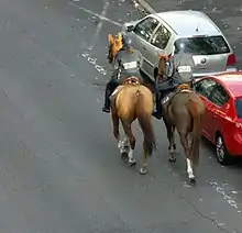 The approach has been characterized as "backward-looking" or "folkloristic" according to the 2012 CGAAER mission, "the horse in town still makes some people smile".[70] Some elected representatives feel that setting up mounted or harnessed public service missions is costly, that horses require too much time investment for their upkeep, and that their effectiveness is relative. These aspects motivated the withdrawal of teams of mounted municipal police officers in Valence, Versailles and Caen, in 2014 and 2015.[83] Skills adaptation is also a problem. Many young people are attracted to working with horses, but do not always have the appropriate training,[70] the quality of which varies greatly depending on the training organization.[84] Similarly, the characterization of horses is often insufficient to adapt to demand, as breeders do not always have objectives (breeding heavy horses for meat, etc.) in line with needs (the need for a draught horse). Taking account of horse traffic in town can be a safety constraint. The attraction of the animal also requires constant vigilance on the part of those working with municipal horses, to guarantee public safety.[70]