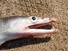 The common pike conger or pike eel (Muraenesox bagio) is a species of eel found throughout most of the Indo-Pacific.[2] In Australia, it is known in the southwest, in Western Australia, around the tropical north of the country, and south to the coast of New South Wales.[3] The common pike conger grows up to 2 m (6 ft 7 in) in length and 7.1 kg (16 lb) in weight.[2] A nocturnal predator, the common pike conger lives in estuaries and near the shore to a depth of 100 m (330 ft).[2][3] A strong and muscular fish, the common pike conger is a delicacy in South East Asia and features in various dishes.[4]