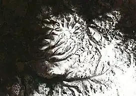 The Murun peak is marked as a 1,452-metre-high (4,764 ft) summit in the O-50 sheet of the Soviet Topographic Map.[2] This same mountain, however, is a 4,820-foot-high (1,469 m) peak in the D-7 sheet of the Defense Mapping Agency Navigation charts.[4] The Irkutsk Oblast-Yakutia border runs across the middle of the Murun Massif and the peak rises on the western, or Irkutsk Oblast side.[2]
