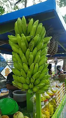 It is assumed that wild bananas were cooked and eaten, as farmers would not have developed the cultivated banana otherwise.[6] Seeded Musa balbisiana fruit are called butuhan ('with seeds') in the Philippines,[7] and kluai tani (กล้วยตานี) in Thailand,[8] where its leaves are used for packaging and crafts.[9] Natural parthenocarpic clones occur through polyploidy and produce edible bananas, examples of which are wild saba bananas.[10]