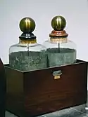 Also large (from today's perspective) devices, mostly made from wood and copper, to measure and display electricity (1900–1930): volt meters, a resistance box, radio valves, a universal bridge, mirror galvanometers, a quadrant electrometer .