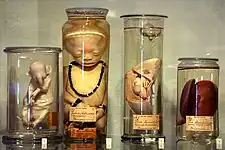 The room shows wax models of human and animal brains (1850–1870), prepared for educational purposes. Also display boxes with carefully arranged human hand bones and foot bones, and several skeletons of small animals. Also some 25 jars containing animals in preservative fuels (alcohol, formalin), some anatomically prepared to show inner organs (1830–1910). Part of the collection in the room was prepared by Jan van der Hoeven (1802–1868), professor of Zoology, Comparative Anatomy, Anthropology, Mineralogy and Geology at the University of Leiden. His portrait is on display. Van der Hoeven studied members of 'exotic races' (as it was called at the time), and produced a large amount of visual materials (drawings, engravings, lithographs). Three of these visual studies are on display.