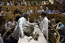 Dissection of a roe deer during the 2nd Leiden Museum Night in the Anatomical Theatre by an animal taxidermist with assistants from Naturalis. The deer had died earlier in a road accident.
