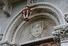 The Tympanum, of Caen stone. Depicts a 19th-century variant coat of arms of the College. This can also be seen on the Campanile