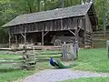 Along with cabins and barns, the museum displays most types of buildings that would be found on a typical pioneer Appalachian farm, including smokehouses, corn cribs, animal pens, mills, an underground dairy and cellar, and a loom house. Blacksmith shops, a working saw mill, a rural schoolhouse, a log church, a broom and rope shop, and a leather shop— all fully equipped with contemporary materials— are also on display and are occasionally used for demonstrations.[5]