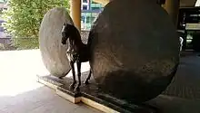 The Roman collection totals over 47,000 objects, mostly from the Roman-occupied areas of the City of London and Southwark, including the UK's largest collection of terra sigillata (samianware). It also includes entire wall paintings and floors such as the Bucklersbury Mosaic; metalwork such as hipposandals, cutlery, jewellery and tweezers; four leather "bikini bottoms", possibly worn by female acrobats; and a wooden ladder.[35] In September 1954, a Roman temple to the god Mithras was discovered in the City of London. An estimated 400,000 members of the public visited the site while it was being excavated,[36] a job which was mostly carried out by archaeology students led by the then director of the London Museum, W. F. Grimes. The building stones of the temple have been reconstructed on their original site at the London Mithraeum, while the marble carvings found inside are part of the collections of the Museum of London.[37]