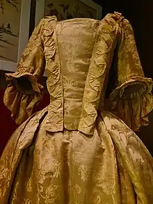 The museum's dress and textile collection spans 23,000 homemade garments and professionally-made creations from the Tudor period to the modern day, and some have been in the collection since the London Museum's inception in 1911, at a time when few museums showed interest in clothing. The London Museum was the first British museum to produce a catalogue of its costume collection, in 1933. There is a particular focus on clothing made by London dressmakers and tailors, sold in London shops, or worn by Londoners. The museum's collection includes pieces by Lucile, Hardy Amies, Norman Hartnell, Victor Stiebel, Mary Quant, Katharine Hamnett, and Vivienne Westwood. The collection also includes several pieces of royal clothing, including a shirt thought to have belonged to Charles I; many theatrical, ballet, circus, music hall, and opera costumes; and silk garments woven in Spitalfields. Outside of clothing, the museum also holds banners and sashes related to the female suffrage campaign of the early 20th century, the Kindred of the Kibbo Kift, and dockworker trade unions.[44] The collection also includes several objects examined by fashion historian Janet Arnold in her book series Patterns of Fashion- eight dresses dating 1860-1930 from Patterns of Fashion 1, a 16th-century leather jerkin from Patterns of Fashion 3, and a shirt and two smocks from the late 16th to early 17th centuries featured in Patterns of Fashion 4.[45]