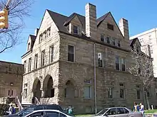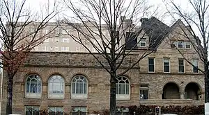 A one-story addition was added presumably in the 1920s which was given a Richardsonian Romanesque stone facing, estimated to have been added in the 1950s, that matched the original house. The university's Department of Music moved into the building in 1971 from its previous quarters on the ninth floor of the Cathedral of Learning.[9] The Music Building was renovated in 2003 which included the installation of elevators.[4] It also houses the Music Department Library, a piano lab, the electronic music studio, the ethnomusicology lab, a student/faculty lounge, practice rooms, teaching studios, offices, seminar rooms, and classrooms.[8][10] It also contains the William Russell Robinson Recording Studio that is a 32-track digital recording facility which offer students hands-on experience in the latest recording techniques and technology.[11]