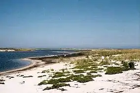 The island was part of Dukes County until 1887 when it was annexed by Nantucket County.[2] Shortly after, land on the island was purchased to form the Muskeget Island Club for waterfowl hunting, and several buildings were constructed.[1] Around 1950, half of the island, along with the 8 buildings standing at that time, was purchased by a partnership led by aviator Crocker Snow Sr. (as erosion has changed the shape of that island, that land currently encompasses 2/3 of the island).[1] Snow, who built the Muskeget Island Airport there with his son Crocker Snow Jr., became full owner of the property after the other two partners died.[3] Snow Jr. wrote several books on the island and its ecology[4] and pushed to have it designated as a National Natural Landmark by the National Park Service in April 1980,[5] and having a conservation restriction placed on the island in 2009.[1]