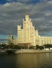 In August 2014, Mustang Wanted climbed Kotelnicheskaya Embankment Building in Moscow, painted the upper half of the star at the top of the building in blue and raised the Ukrainian flag above it.