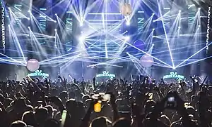 Mustard's production style has been described as an up-tempo, radio-friendly, club-oriented, catchy hip hop style which he calls "ratchet music".[4][5][6][7] Mustard's body of work has been recognized by critics as sonically cohesive and recognizable in that many of his tracks have recurring, identifiable motifs.[26] Most apparent is his producer signature "Mustard on that beat, ho!" which prefaces the beat drop in many of his songs.[26] This signature is often strategically placed to span the third and fourth counts of the measure preceding the song's drop to make it more catchy. On a compositional level, however, Mustard's motifs also include: an ambient chant of "Hey!" on the off-beats in the background of his music;[26] the emphasized, minimalist bass synth opening to many songs (most notably on "My Nigga", "R.I.P.", and "Rack City"),[27] 808 kicks[28][29][30] and the use of crisp hand-claps and snap-snares.[31]