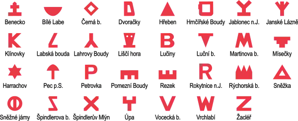 The system is created by the set of blazes, which are cut out of sheet metal and painted red. However, compared to classic blazing systems, they do not mark particular routes or hiking trails. Each sign corresponds to a different object in the mountains, the most frequent being the nearest mountain huts and villages with the possibility of overnighting and catering. The blazes are usually suspended on high poles, which makes them visible even when covered in snow – thus the system can be used by skiers or for winter hiking.