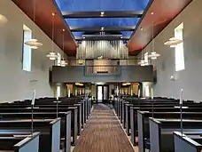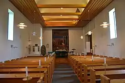 The church was comprehensively restored in 2016 to its original design.[2] Most notably, the interior colour scheme was changed from its pre-renovation white and light wood — often associated with Aalto's minimalist style — to the original, more colourful one consisting of bright blue and red ceiling and dark grey fixtures.[5]